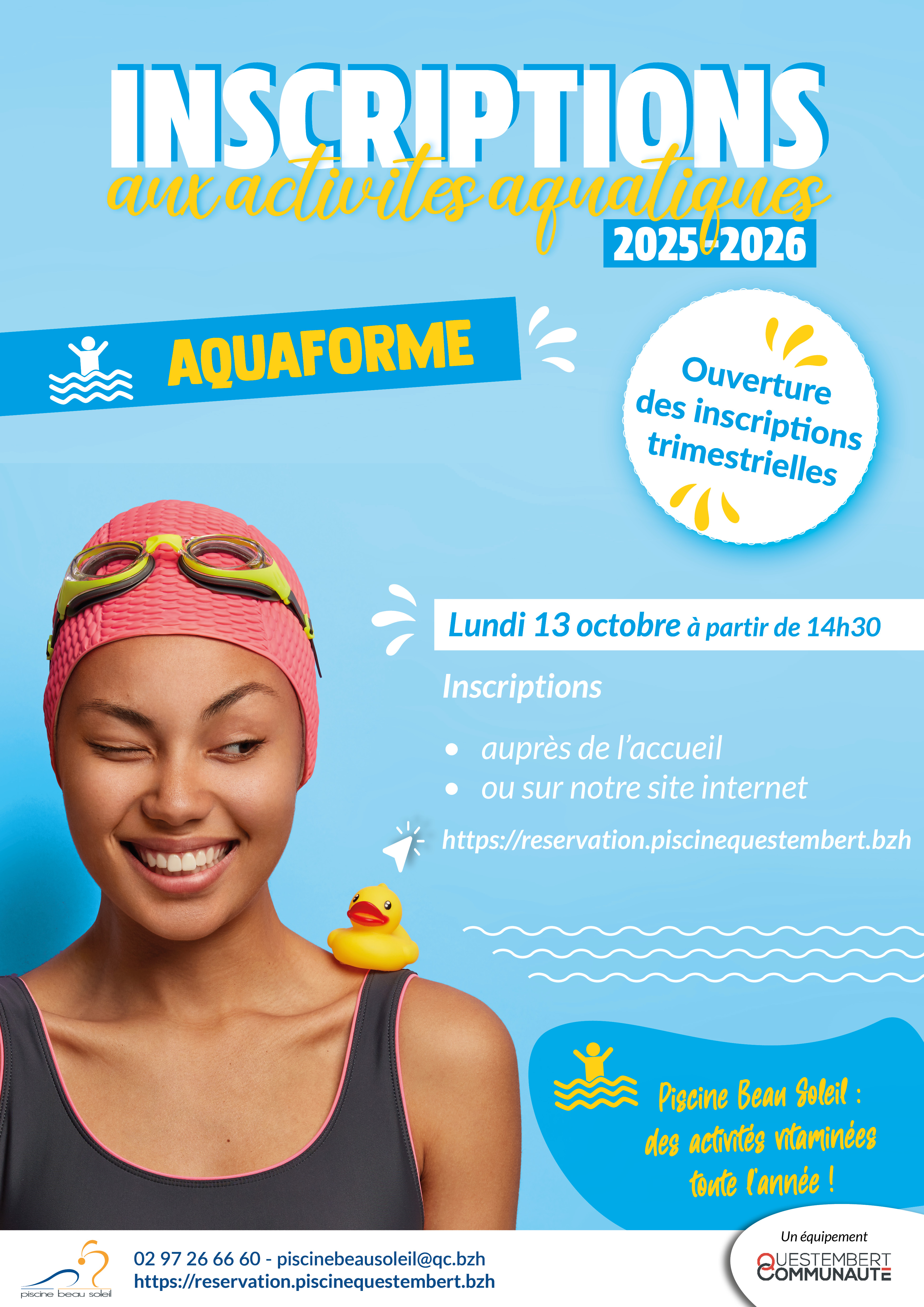Les inscriptions trimestrielles aux activités Aquaforme (Aquagym, Aquabike, Aqua Cross'Nat, Aquatraining...) ouvriront le lundi 13 octobre 2025 à partir de 14h30.